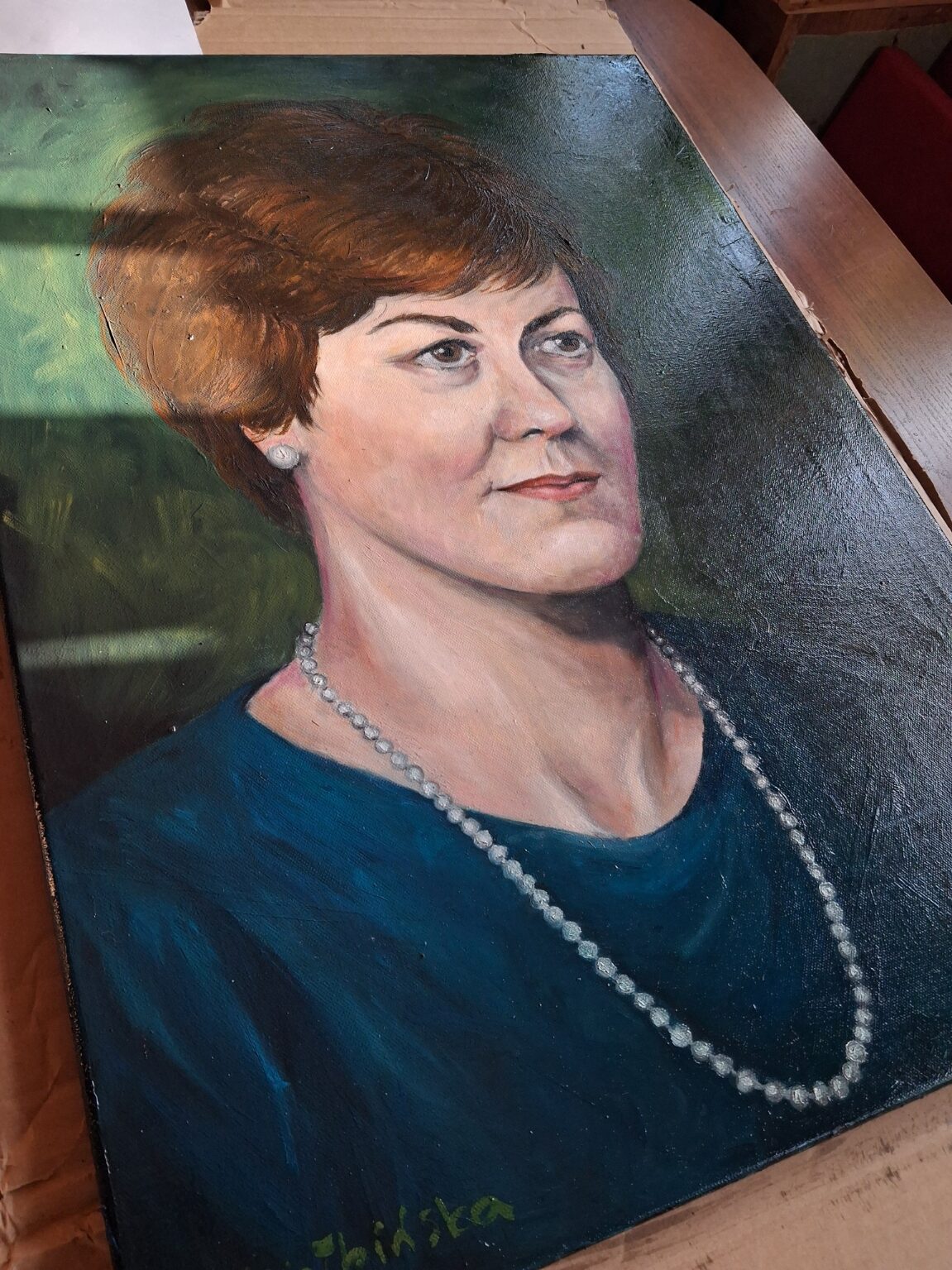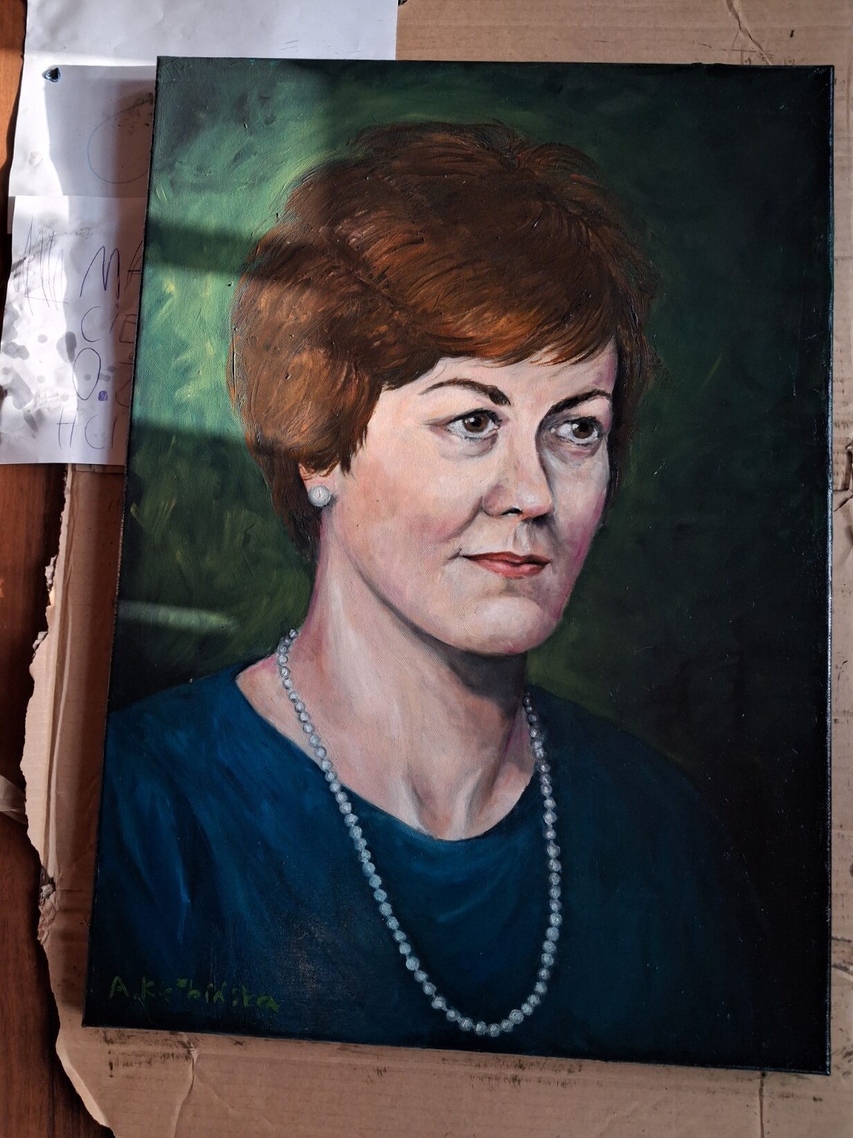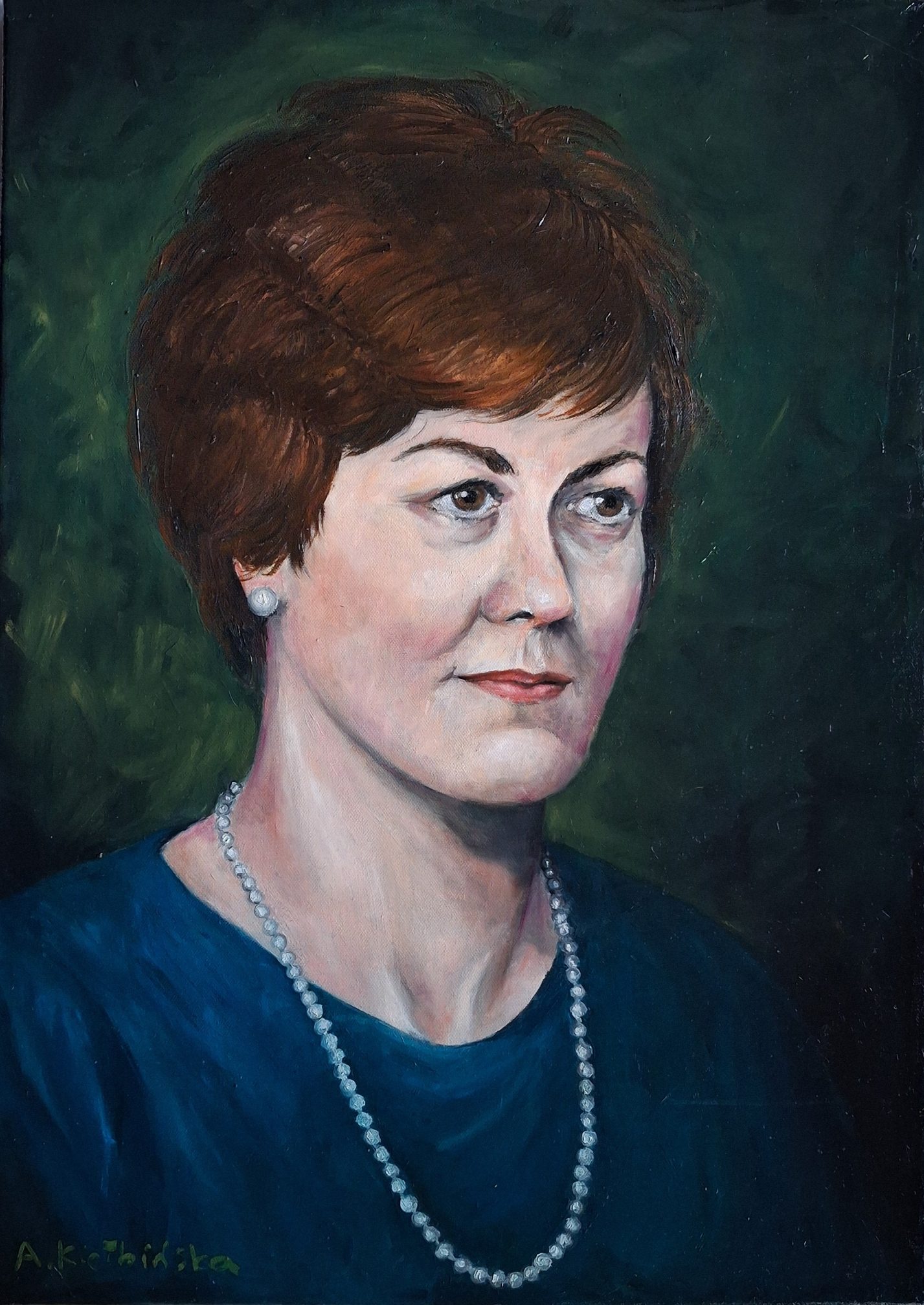 Musiałam bowiem namalować portret bazując na jedynych dwóch zdjęciach, jakie posiadali jej bliscy – jedno bardzo piękne, czarno białe, tyle że z młodości. Drugie znacznie późniejsze, kolorowe, lecz bardzo niewyraźne. Oba robione w czasach przedcyfrowych. Cóż było czynić? Musiałam zgadywać. Uciekłam się w tym celu do praktyk spirytystycznych. Ogólnie kiepskie ze mnie medium a i praktykę mam marną, bo mnie w dzieciństwie straszyli duchami. Nie mam tego stolika z literkami i w ogóle. Zresztą literki niewiele by pomogły bo przecież chodziło o obraz a nie opis.